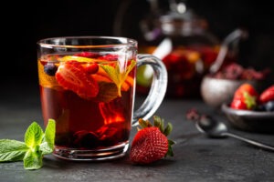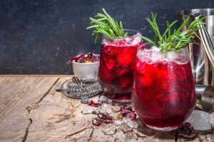 Brew hibiscus tea and mix with a splash of berry juice for a tart and refreshing herbal iced tea.